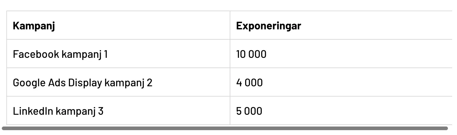 För att kunna genomföra en bra jämförelse mellan olika typer av aktiviteter för varumärket så behövs dock mer än bara exponeringar. I fallet nedan ser vi att den bästa aktiviteten är Facebook kampanj 1 som har 10 000 exponeringar jämfört med Google Ads Display kampanj 2 som har 4000 exponeringar och LinkedIn kampanj 3 som har 5 000.