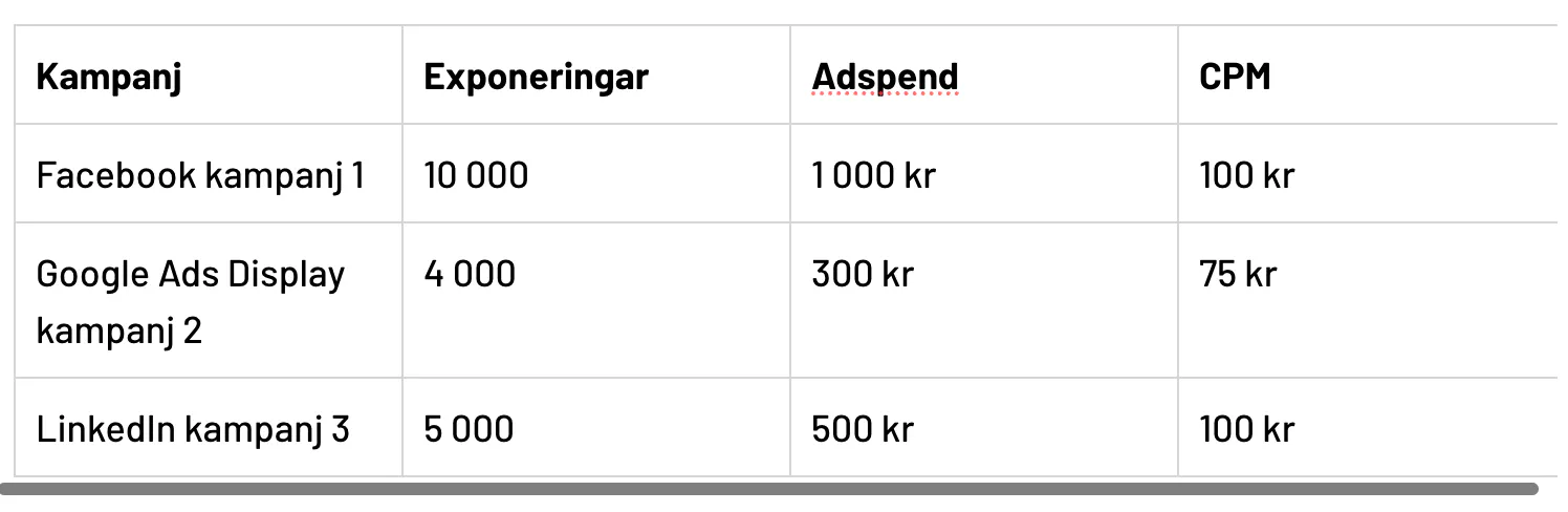 Men om vi ser till helheten så kommer det visa sig att den mest effektiva kampanjen är display kampanj 2 via Google Ads om man ser till CPM (Cost per mille). CPM är ett vanligt mått och brukar beräknas genom att dividera Adspend med antal tusen exponeringar.