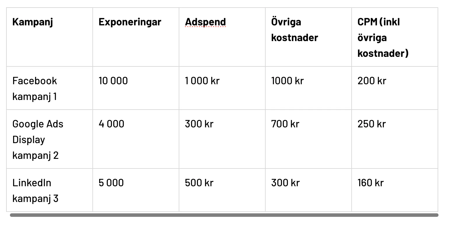 Tar vi detta ytterligare ett steg så är det också relevant att ta hänsyn till övriga kostnader som är förknippade med kampanjen. I detta inkluderas t.ex. Byråkostnad för att sätta upp och optimera kampanjen men även kostnad för att ta fram material till kampanjen.